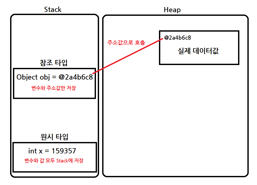 하지만 참조 타입의 경우 변수는 Stack 영역에 객체의 주소값을 저장하나 데이터값은 Heap 영역에 저장한다.